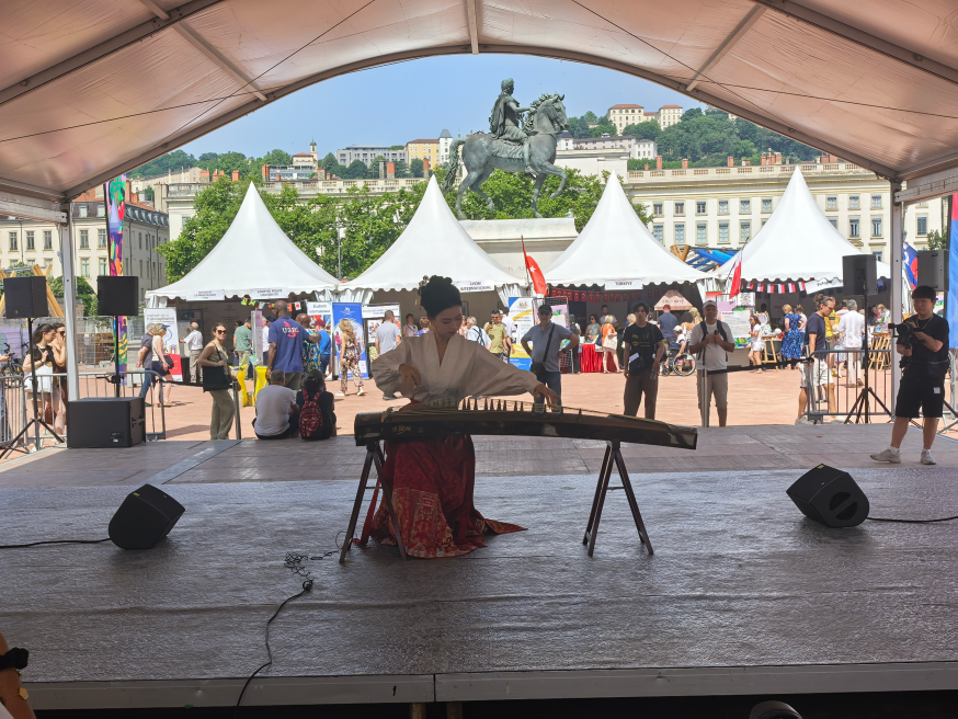 une jeune joueuse chinoise du guzheng s’est produite sur la scène centrale, interprétant des morceaux classiques des deux pays, tandis que m. le maire doucet s’est arrêté pour écouter avec attention. le public ne cesse d’applaudir et d’acclamer chaleureusement.