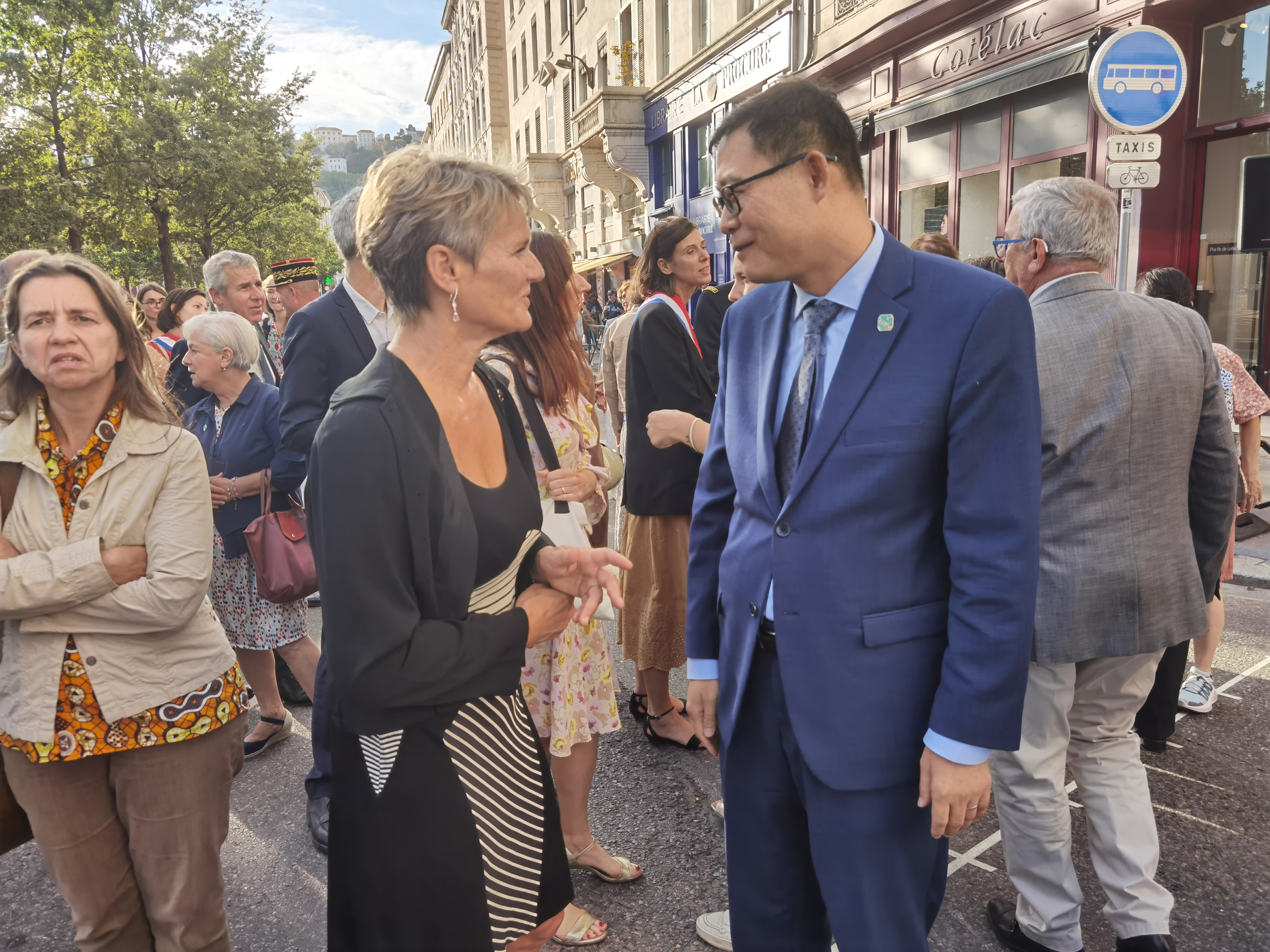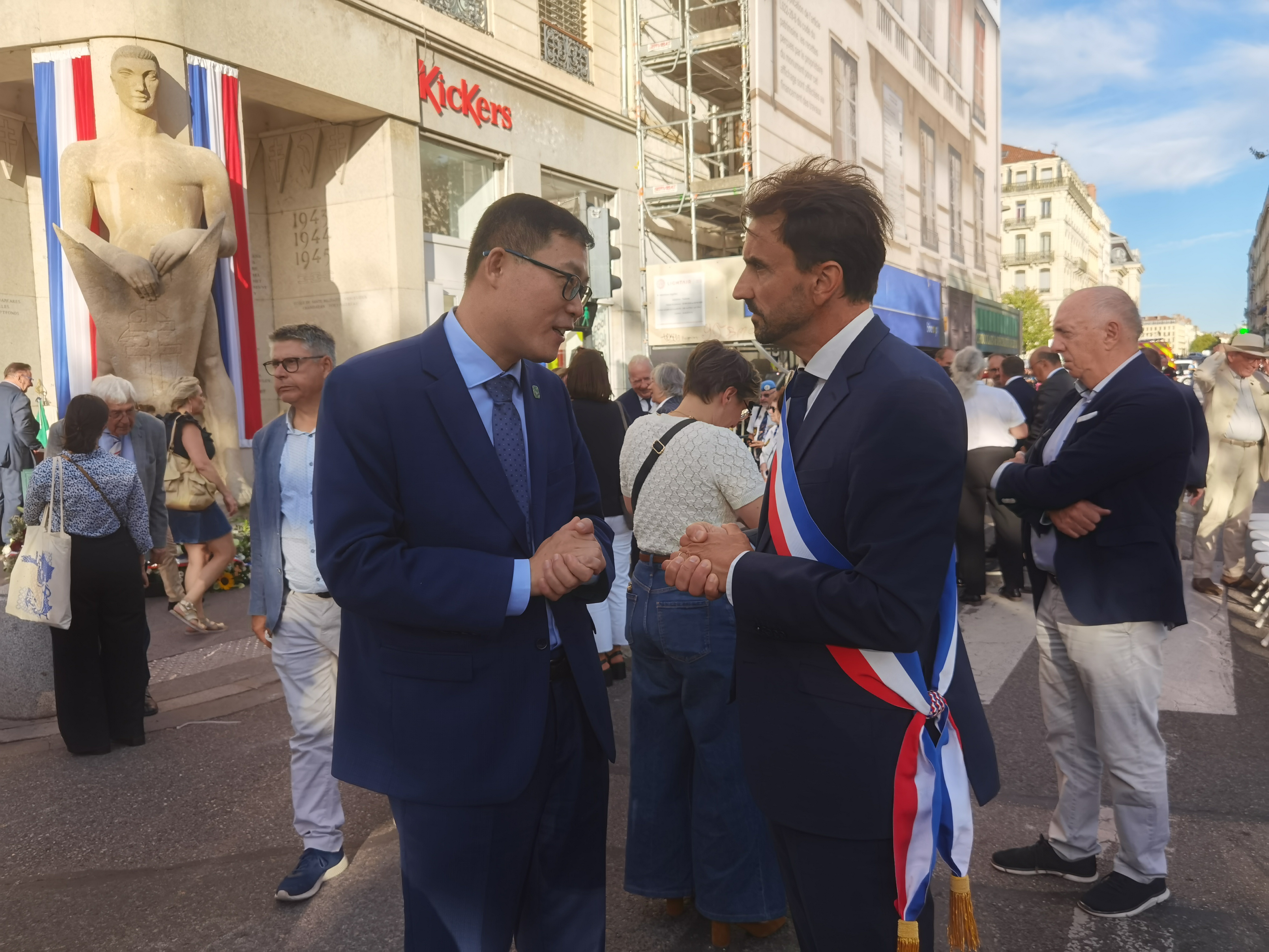 le 3 septembre 2025, m. li zhenping, consul général par intérim de chine à lyon, a assisté à la cérémonie commémorative du 81e anniversaire de la libération de lyon. à cette occasion, il a eu des échanges avec des personnalités politiques locales, tels que m. grégory doucet, maire de lyon, hélène duvivier-dromain, vice-présidente de la métropole de lyon, et d’autres invités de marque.