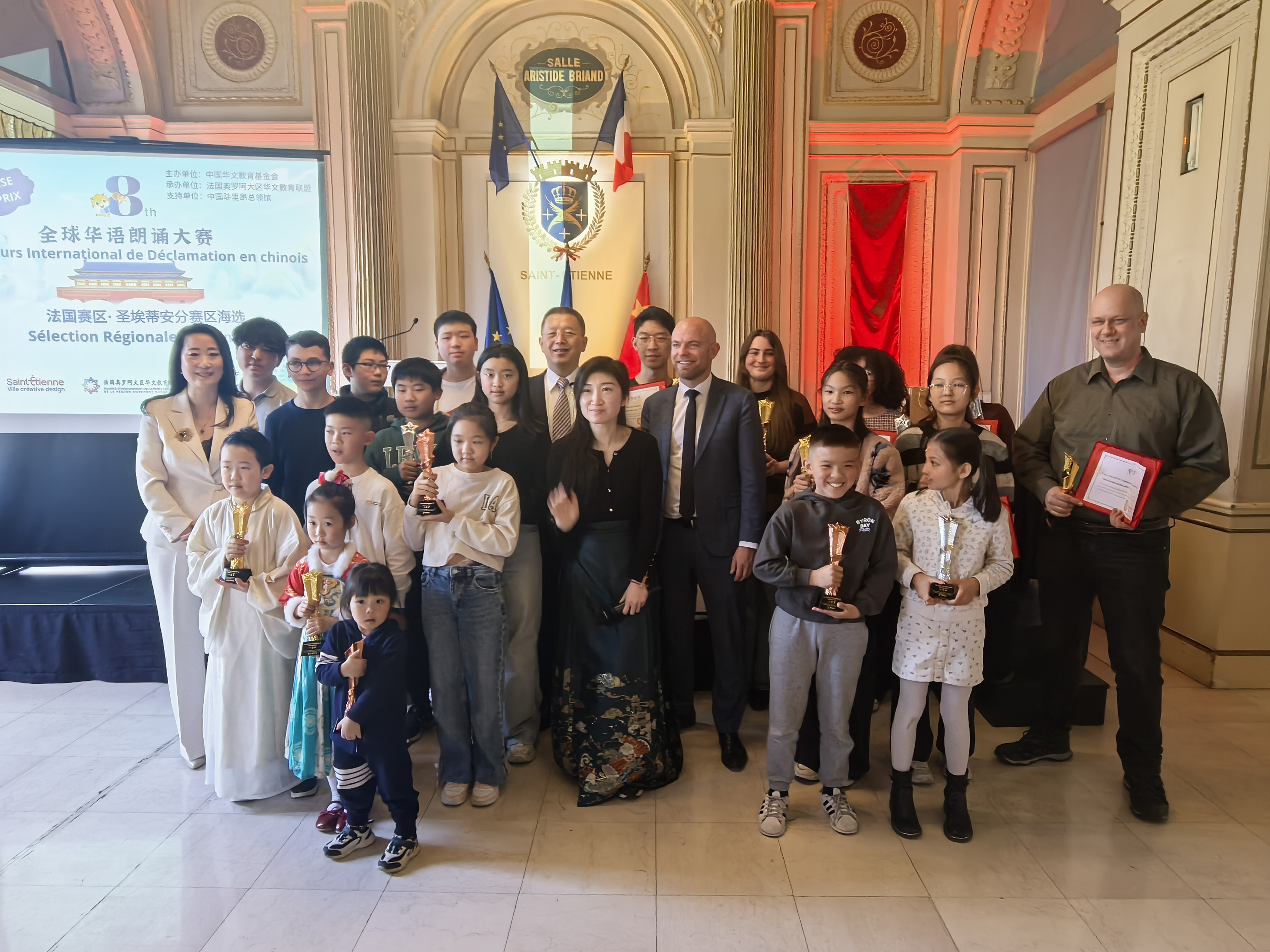 2025年4月22日,驻里昂总领事于江赴领区圣埃蒂安市,出席第八届全球华语朗诵大赛法国圣埃蒂安分赛区颁奖仪式。圣埃蒂安副市长沙索贝内、圣埃蒂安中文学校校长王晓茜、法国小熊猫学校校长罗坚、里昂中国文化之家会长施东伟及当地华校学生、家长、友好人士约80人出席。